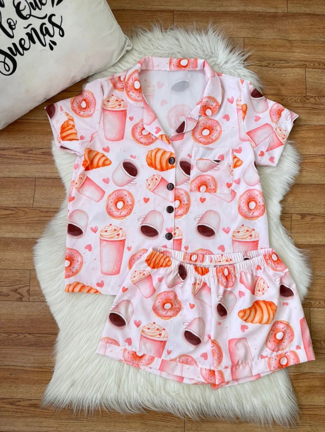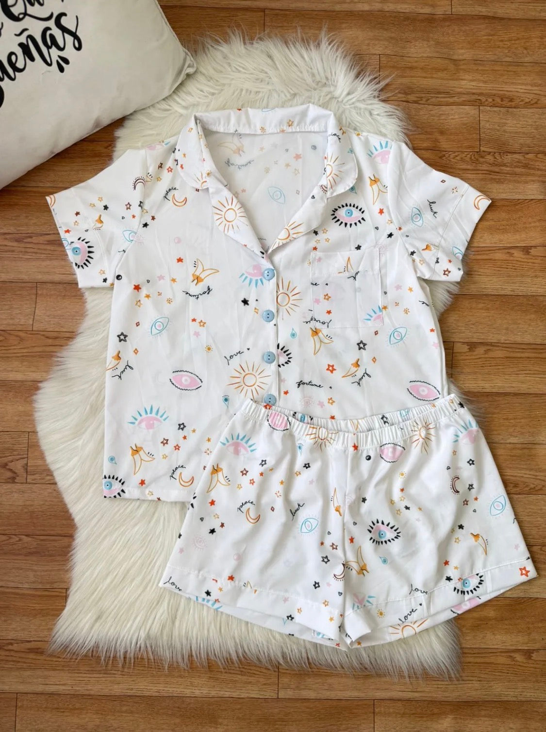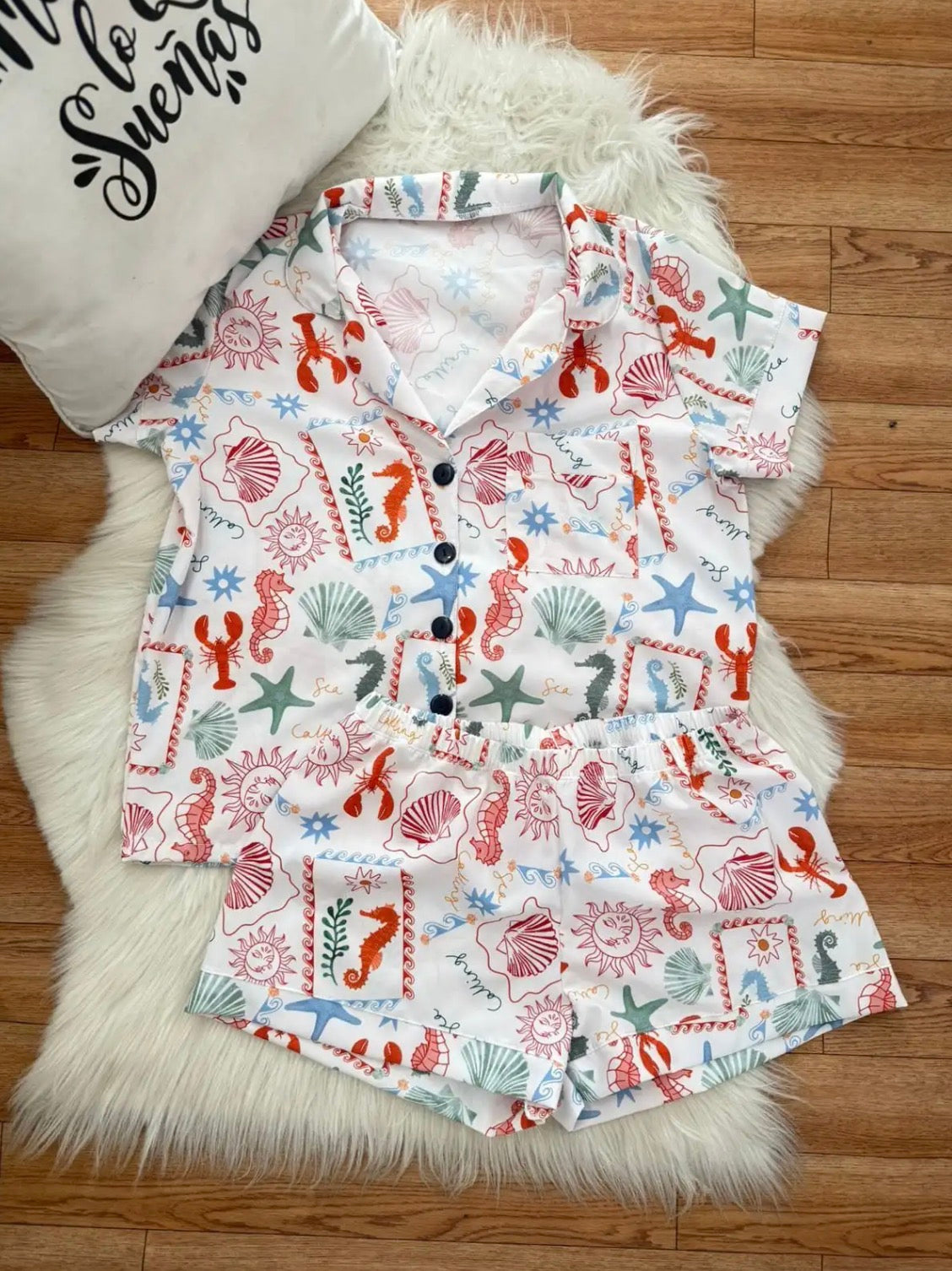 Each design features a classic button-up shirt and matching shorts — playful, feminine, and super comfy