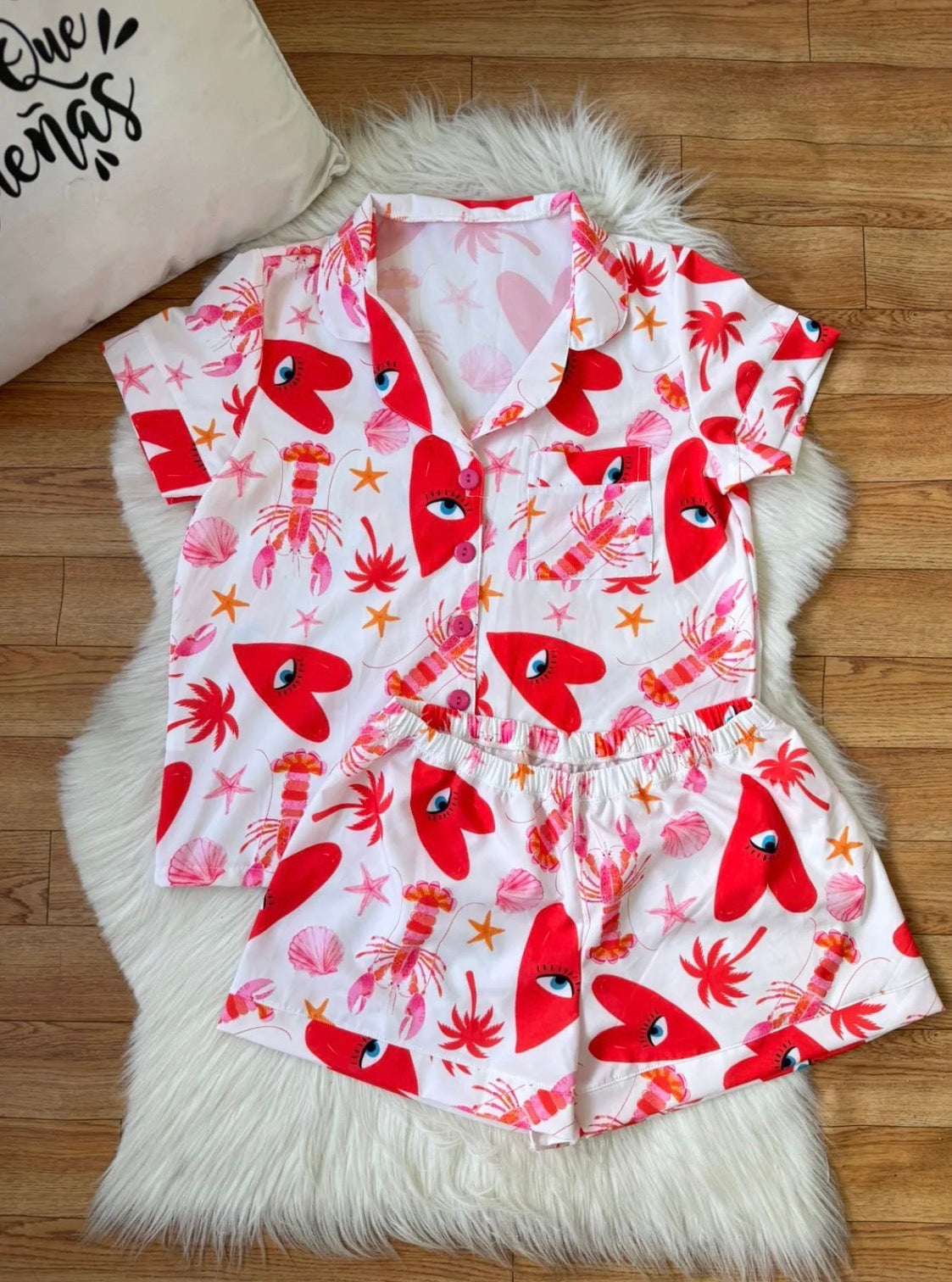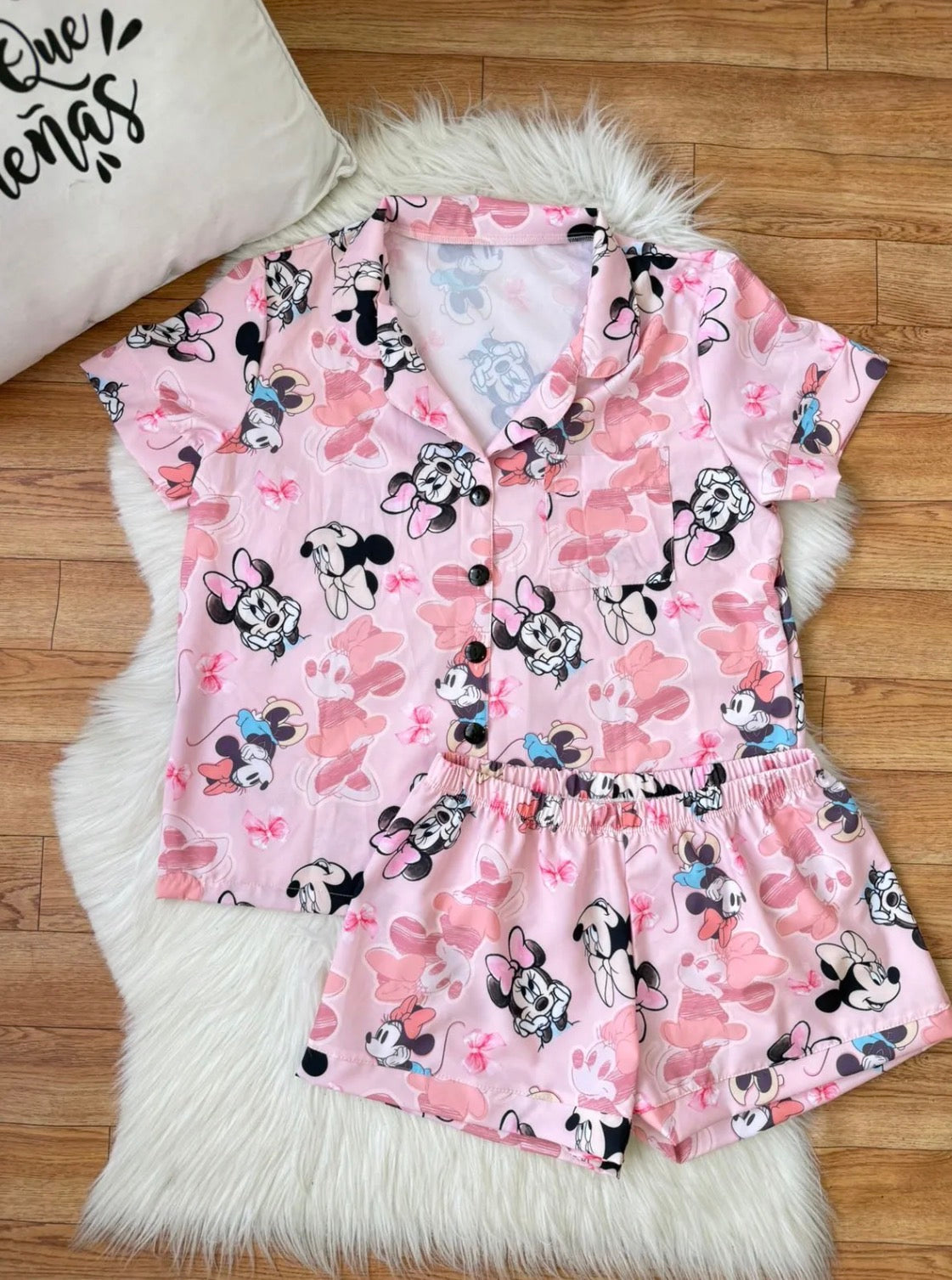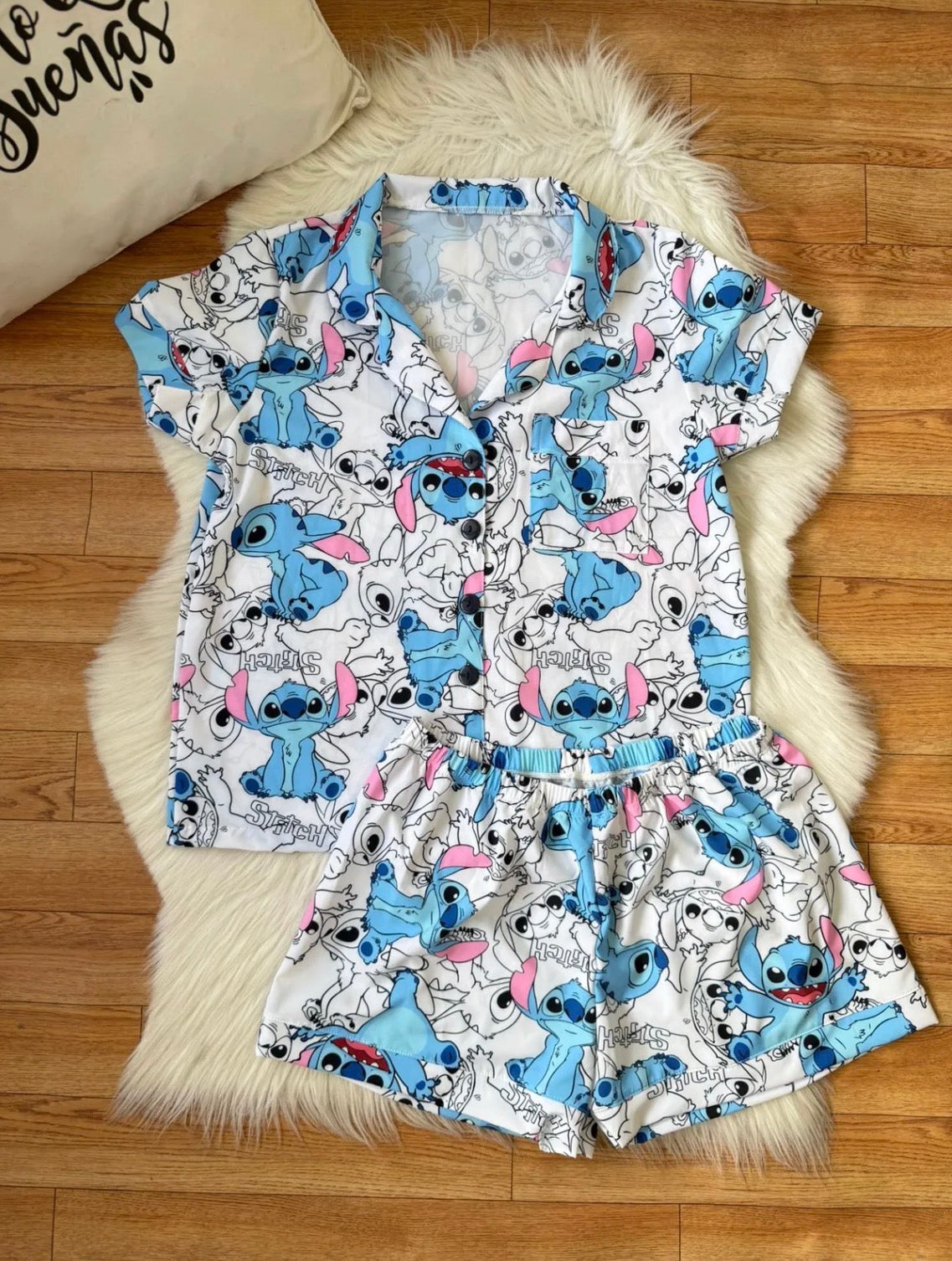 Each design features a classic button-up shirt and matching shorts — playful, feminine, and super comfy